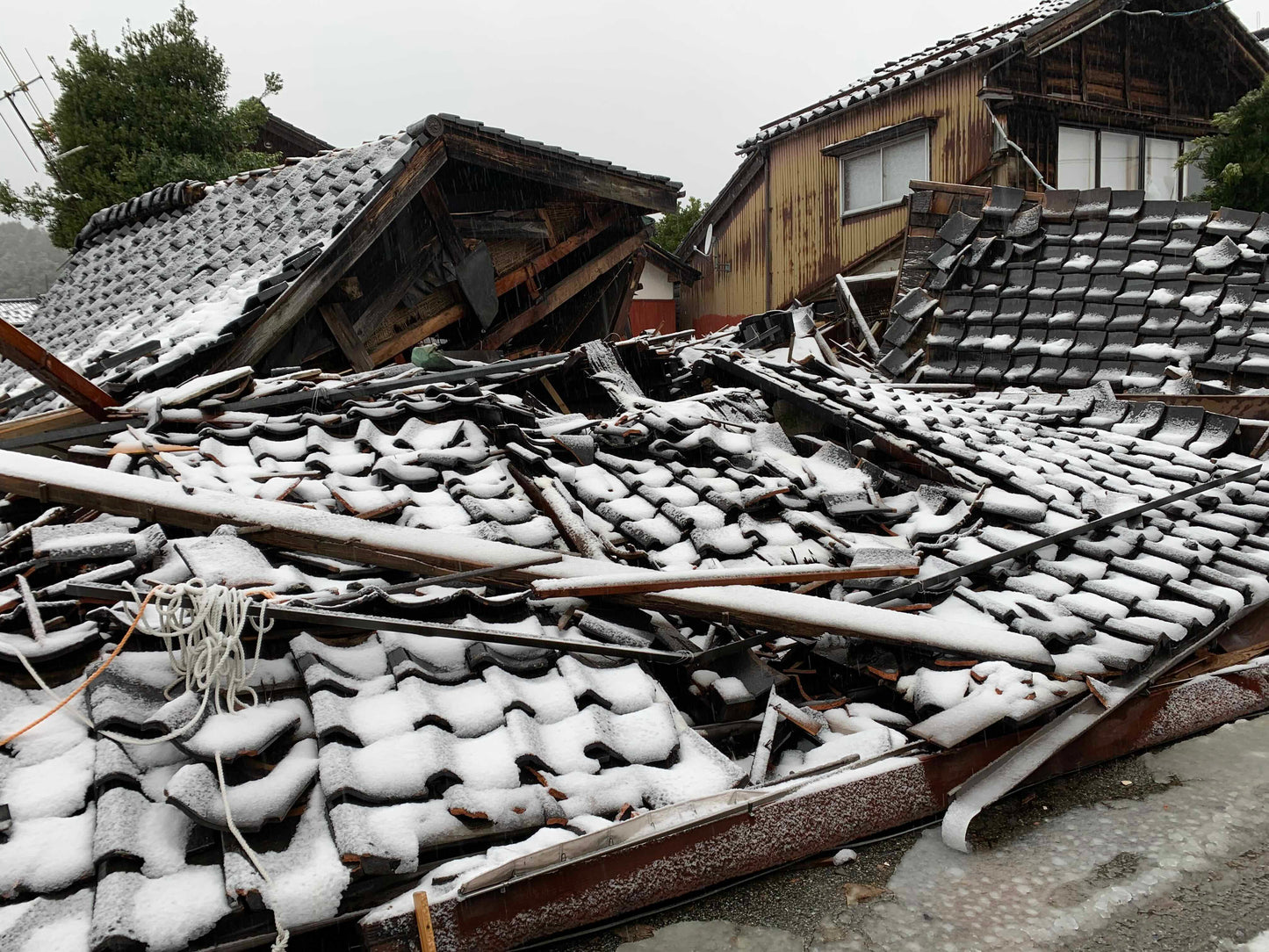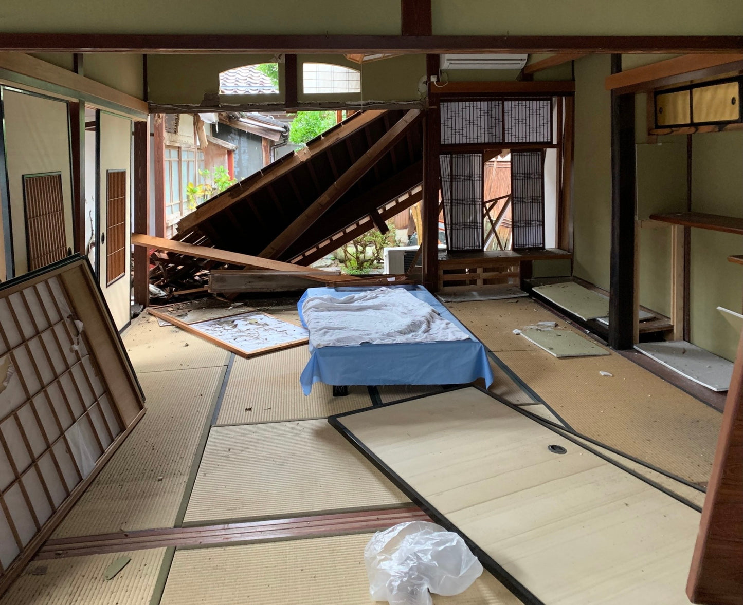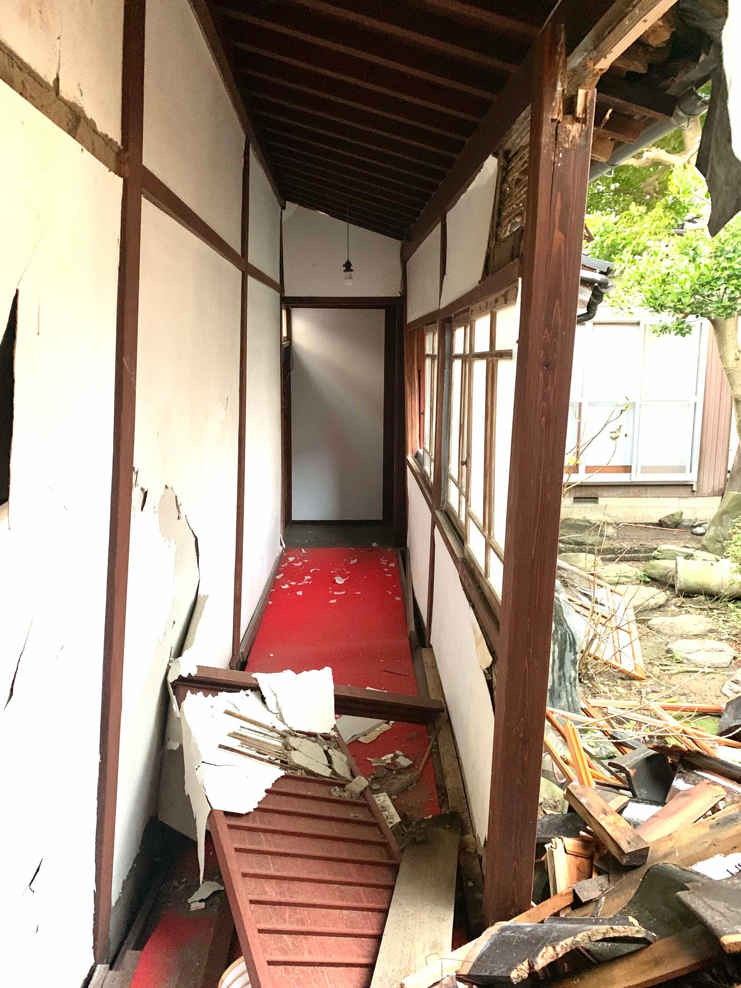 離れは倒壊は免れたものの、地震の揺れで建物全体が束石から落ちてしまい北側に約30cmずれ落ちてしまいました。建物内部も柱が所々傾いたり折れたりしています。縁側のひさしが落ちてしまいました。